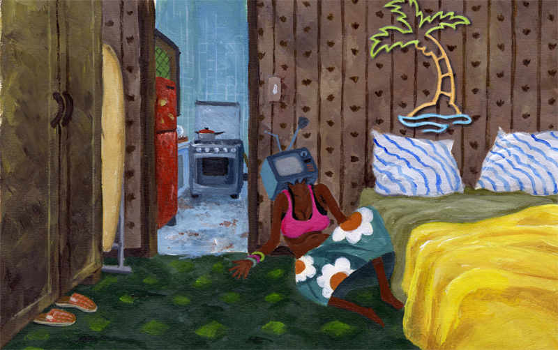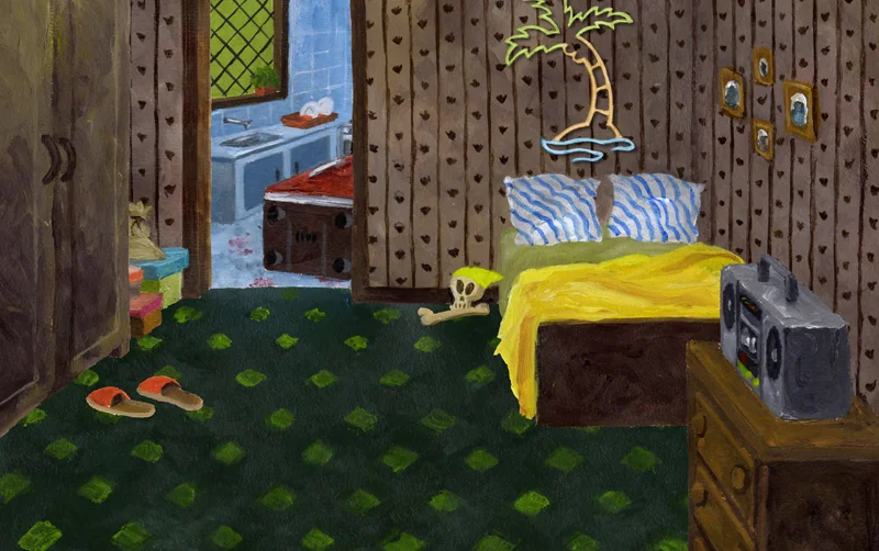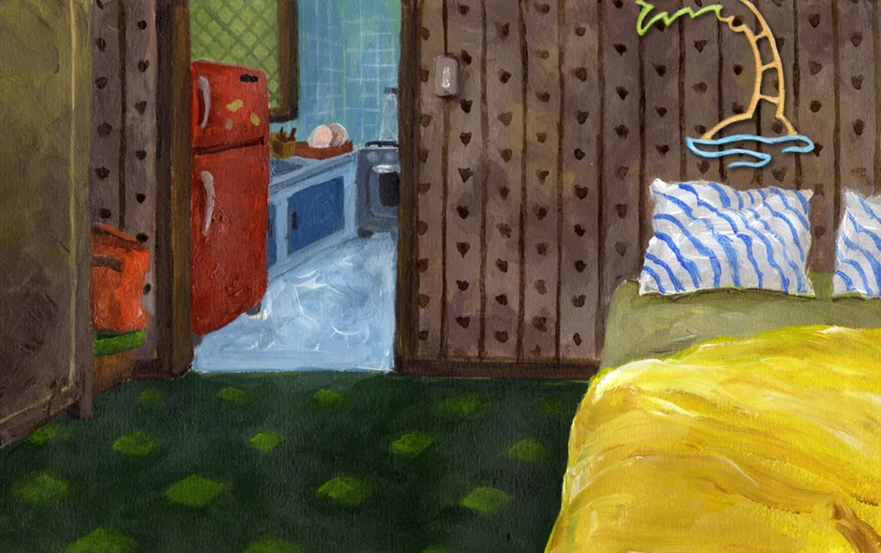 Criação de cenários para cena de animação do filme "Totalmente Inocentes". Todos os cenários foram desenhados a mão e pintados em tinta acrílica sobre papel.