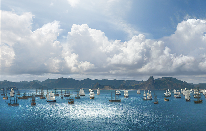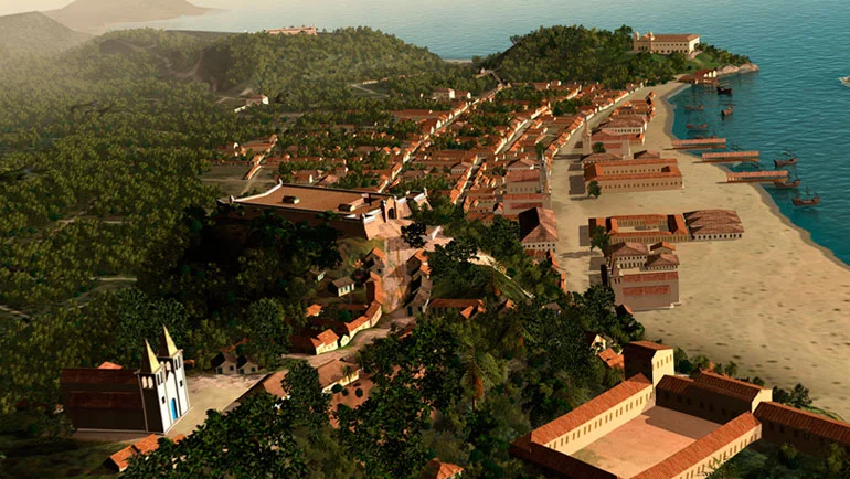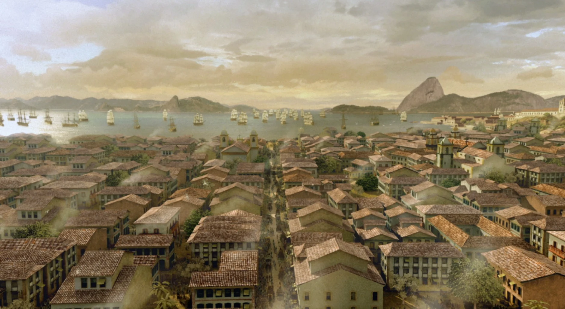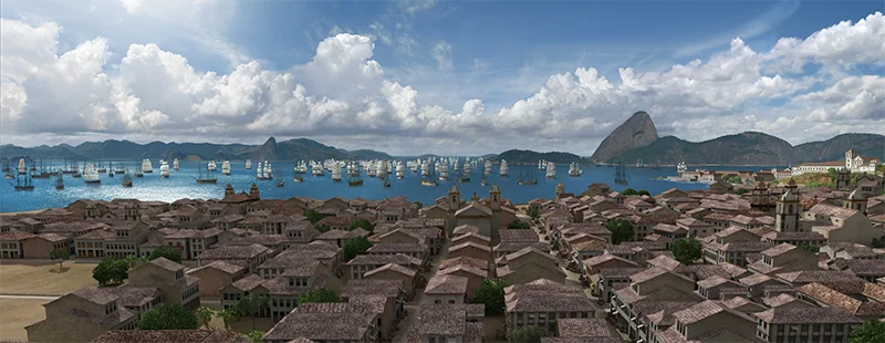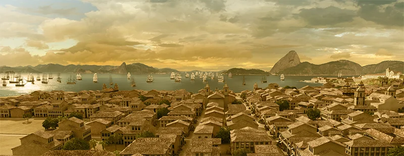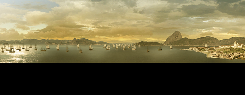 A partir de fotos atuais do Rio de Janeiro foram criadas imagens panôramicas para reproduzir o Rio na época da chegada da família real portuguesa.